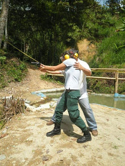 ![]() Posición de tiro - uso de revolver | ![]() listas para la práctica de polígono ! Uso de revolver en espacio cerrado. Fotografia suministrada por la estudiante Alejandra Giraldo | ![]() Práctica de Criminalística general: Elaboración de positivo de huella de calzado. Colaboración de la exalumna Alejandra Arenas P. Sep/2014 |