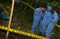 ![]() práctica en el BITER Piedras (TOL) | ![]() Alumnos de 1o. y 2o. Semestre en el Cerro de Monserrate. a 3125 metros de altura. Al fondo, el Santuario. Bogotá D.C. | ![]() Visita a la morgue, actividad de la clase de Anatomía forense. En la foto, algunas alumnas posan usando el traje de bio-seguridad |
